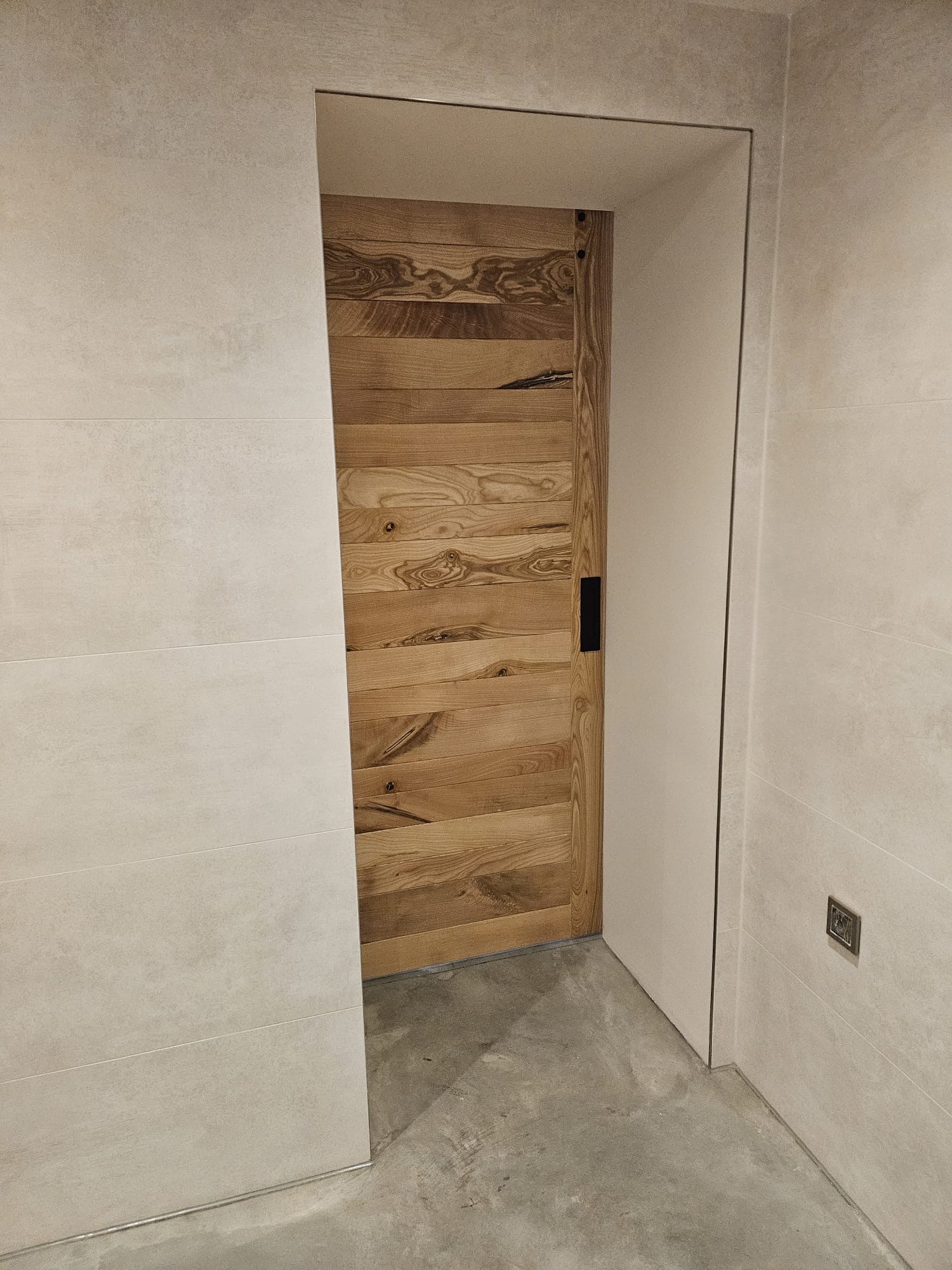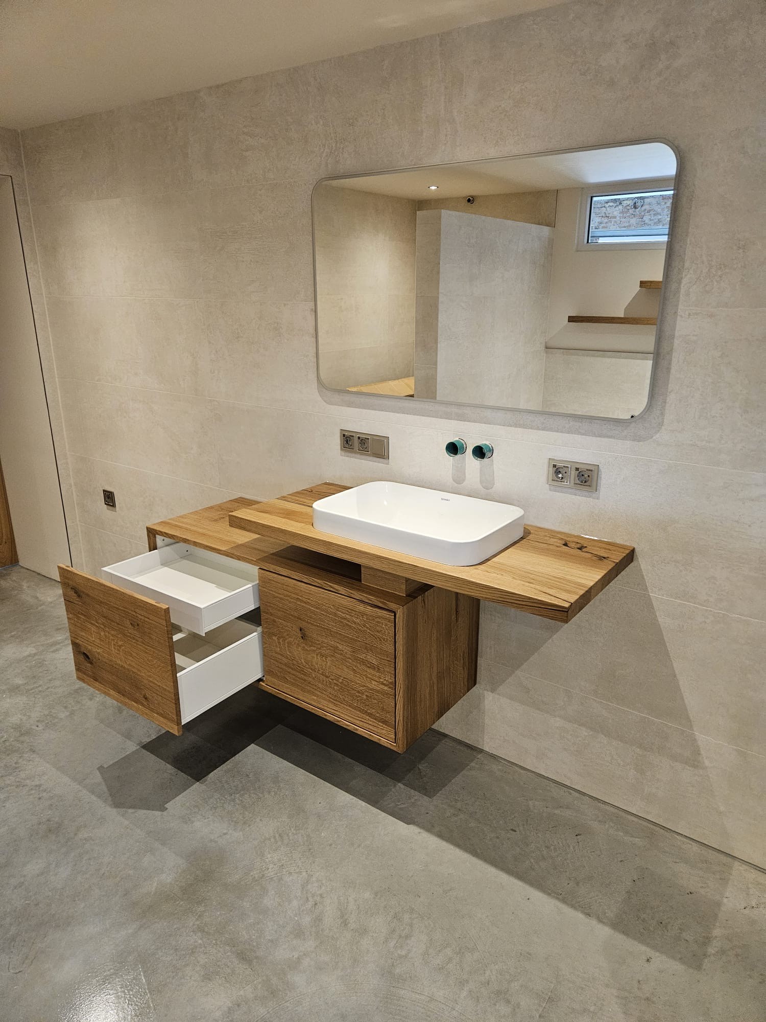 Für dieses Projekt entstanden gleich zwei maßgefertigte Elemente: ein eleganter Waschtisch aus Eiche sowie passende Türen aus Esche. Beide Holzarten überzeugen durch ihre natürliche Maserung und bringen eine warme, hochwertige Atmosphäre in den Raum. Der Waschtisch bietet nicht nur eine stabile und langlebige Basis, sondern ist auch ein optisches Highlight im Badezimmer.