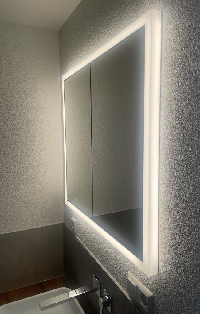 Ergänzt wird der Waschtisch durch einen stilvollen Spiegelschrank mit Doppelspiegeltüren. Diese verstärken das Gefühl von Raum und Licht und machen das Bad optisch größer und freundlicher. Eine rundum integrierte Beleuchtung sorgt für gleichmäßiges Licht und schafft eine angenehme Atmosphäre im Badezimmer.