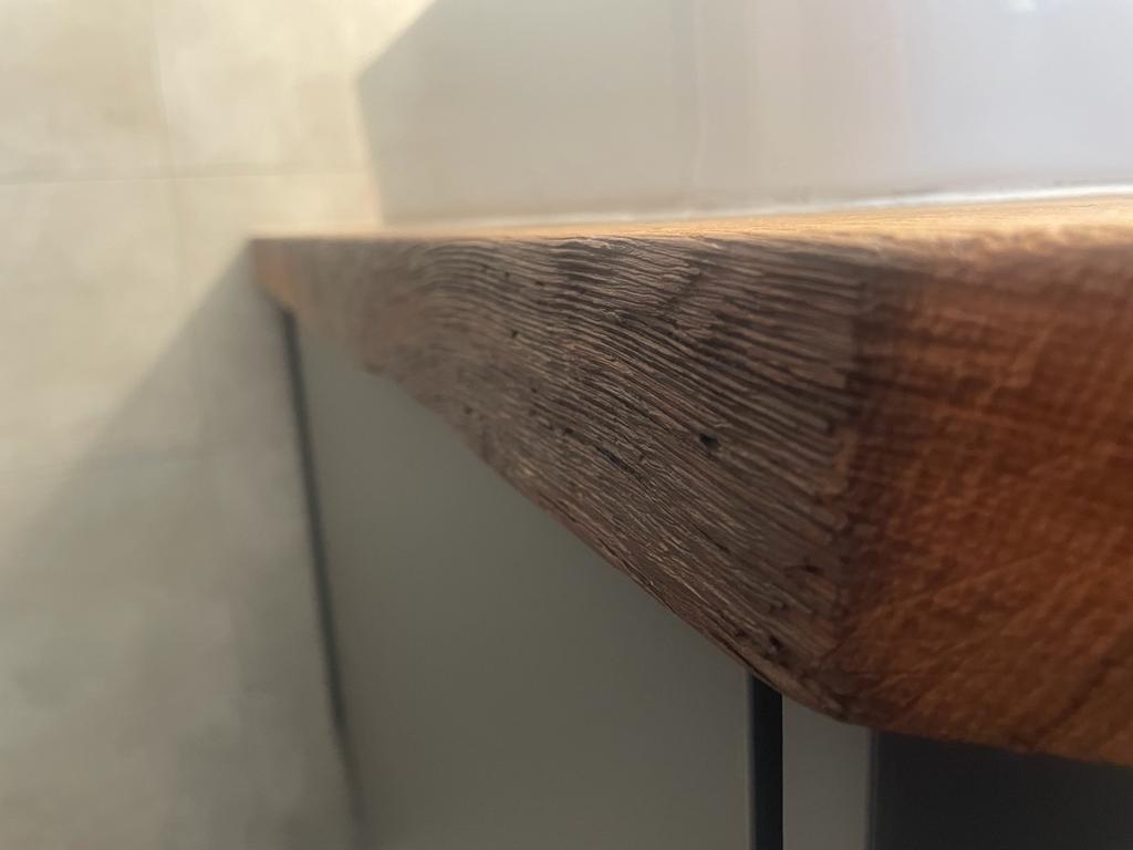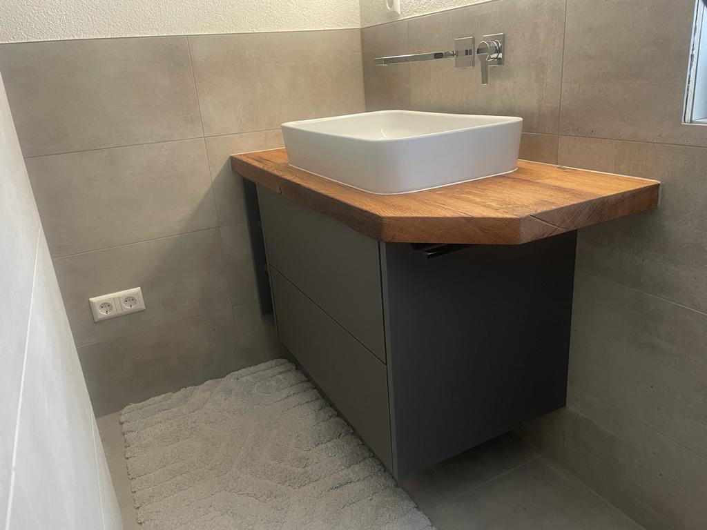 Dieser maßgefertigte Hängewaschtisch überzeugt durch die gelungene Kombination aus natürlichen und modernen Materialien. Die Tischplatte aus massiver Eiche bringt Wärme und Natürlichkeit ins Badezimmer und bietet gleichzeitig eine robuste, langlebige Oberfläche. Der Korpus ist aus hochwertigem basaltgrauem Schichtstoff gefertigt, der für moderne Eleganz sorgt und besonders widerstandsfähig gegenüber Feuchtigkeit und täglicher Beanspruchung ist.