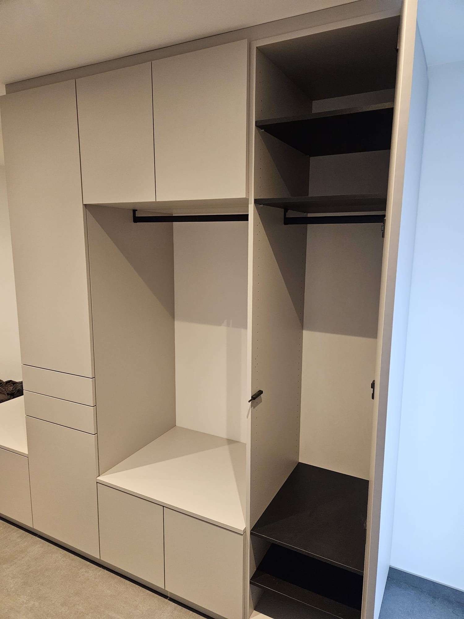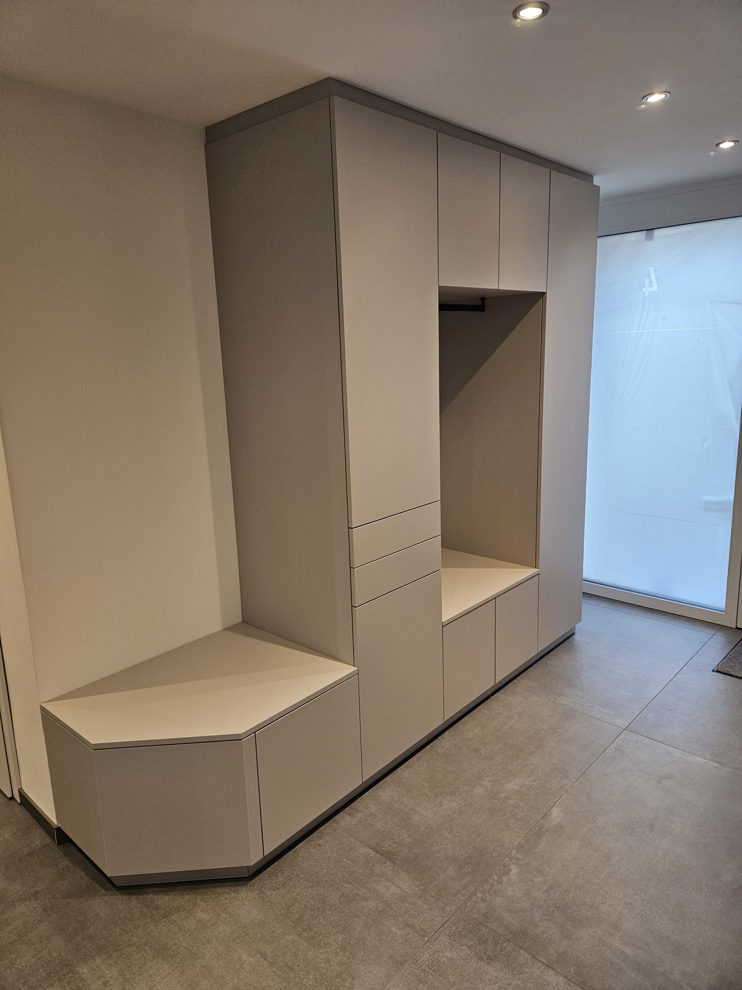 Bei diesem Projekt entstand eine maßgefertigte Garderobe, die modernes Design mit hoher Funktionalität verbindet. Gefertigt aus robustem, beschichtetem Plattenwerkstoff überzeugt sie durch ihre langlebige Qualität und eine elegante Oberfläche in der Dekorfarbe „Delfingrau“. Klare Linien und eine durchdachte Aufteilung sorgen dafür, dass die Garderobe nicht nur optisch ansprechend, sondern auch praktisch im Alltag ist.