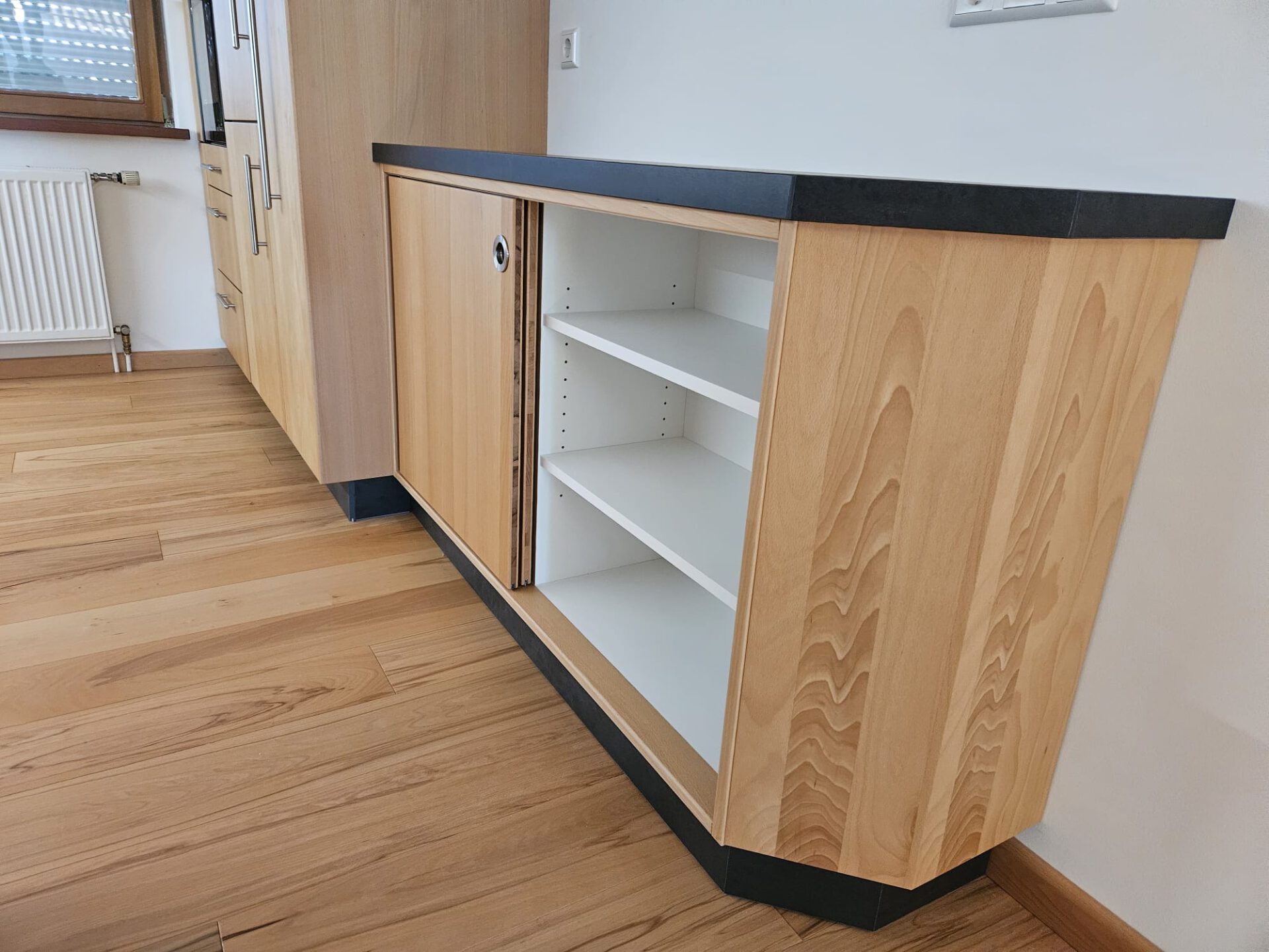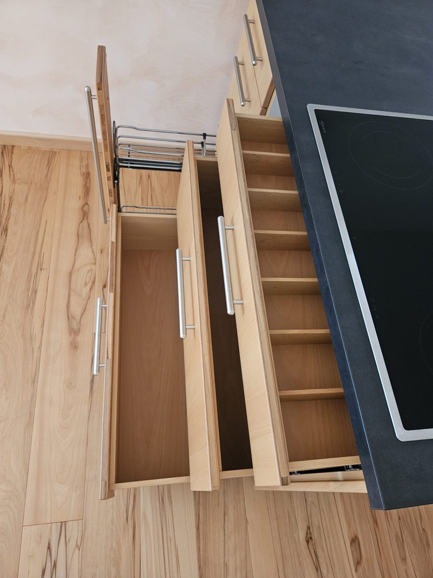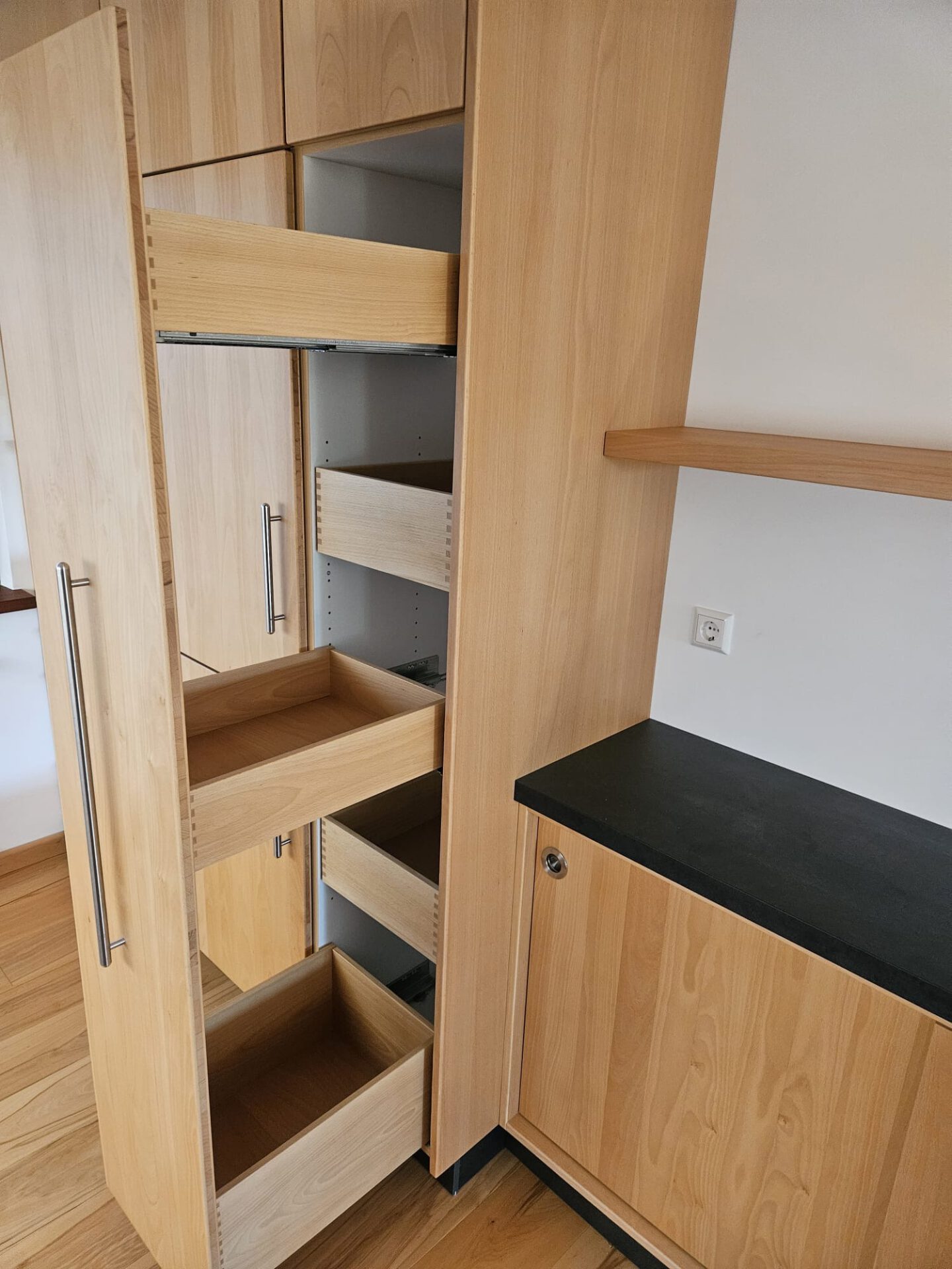 Küche mit massiver Buchenfront – zeitlos, langlebig und funktional, mit viel Stauraum und modern integrierter Technik.