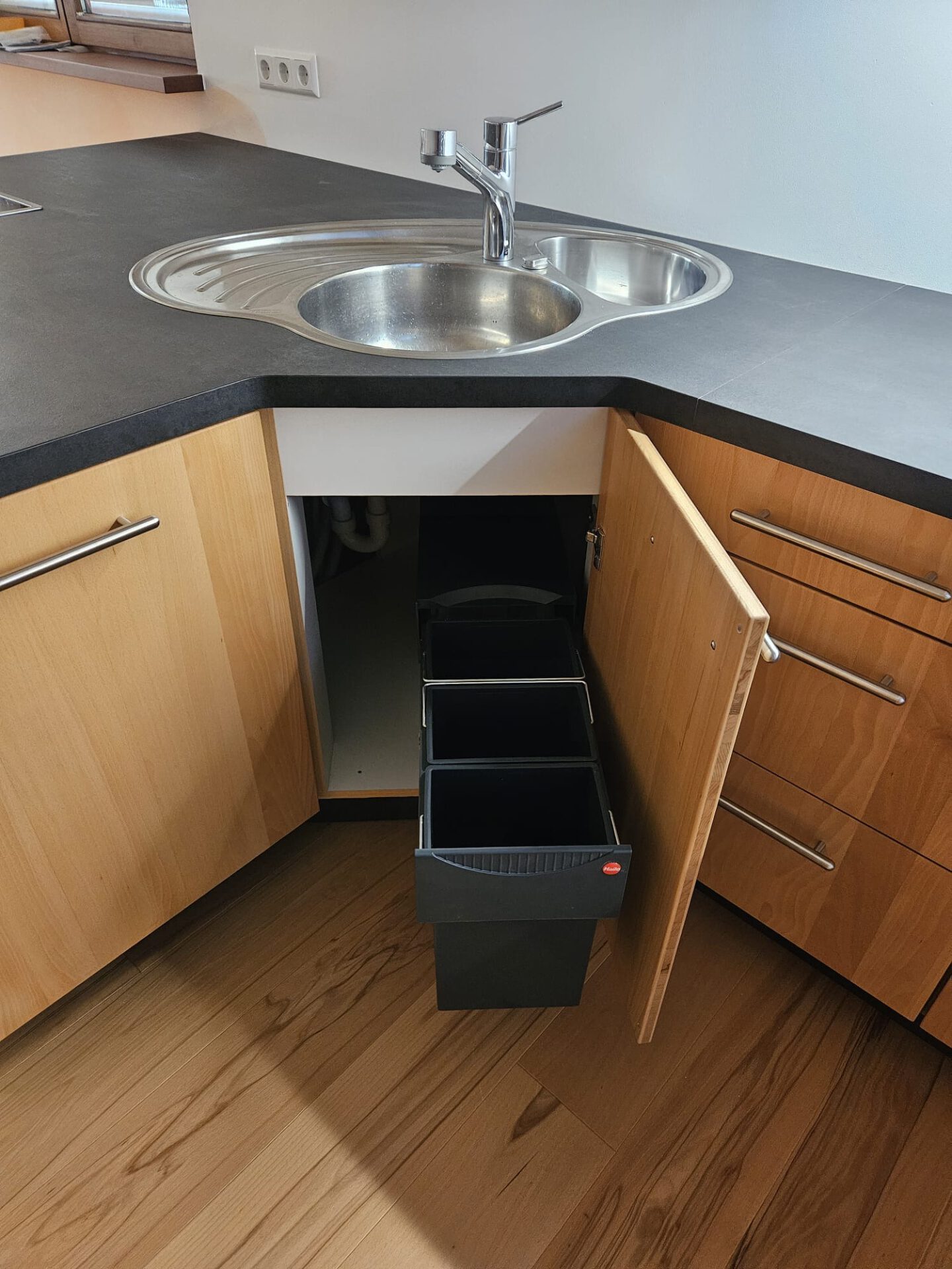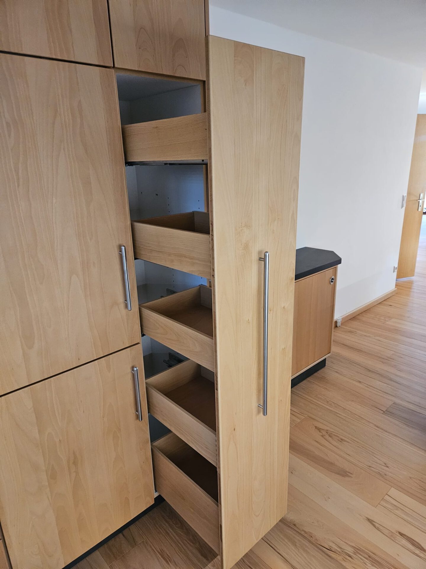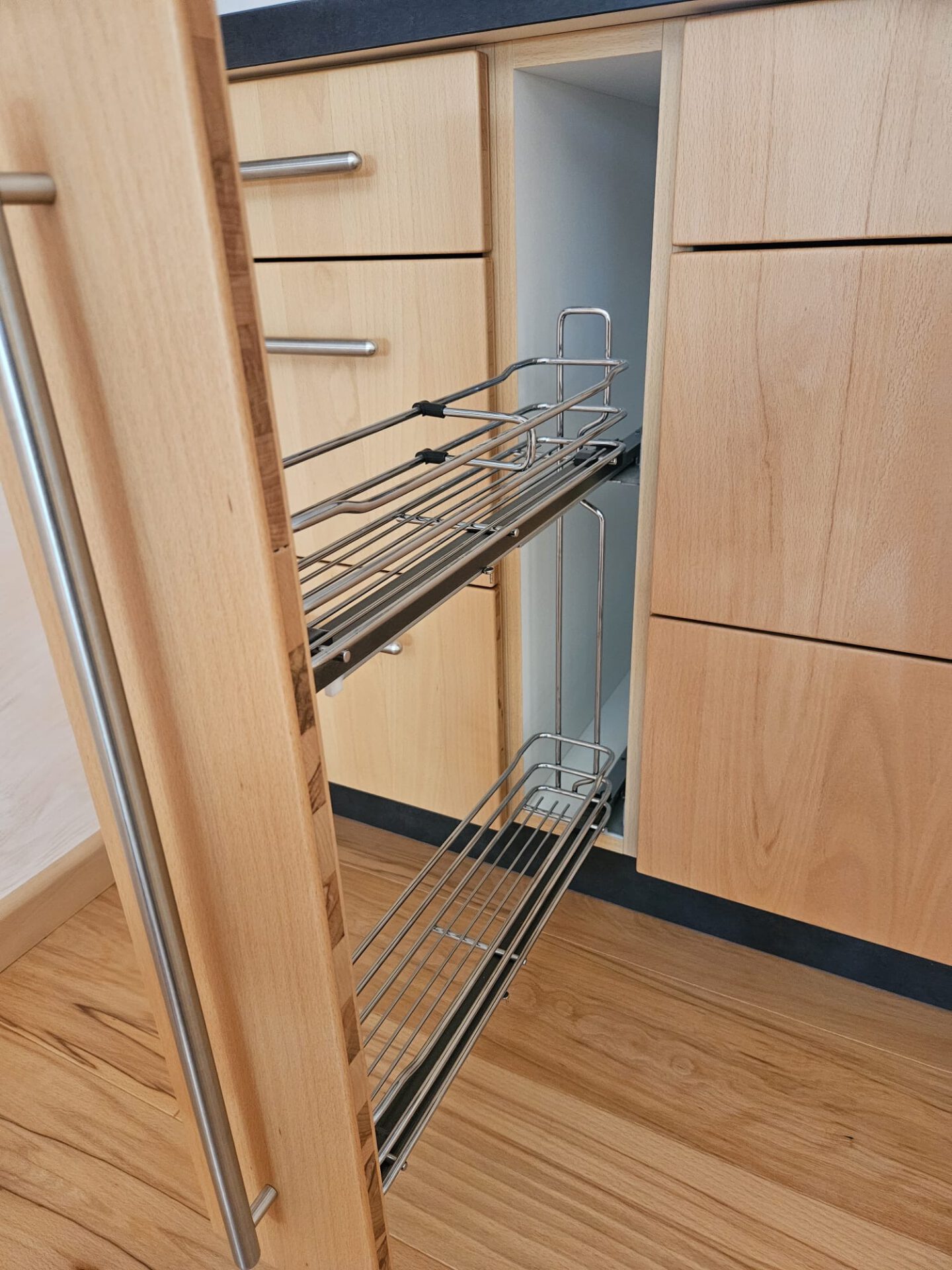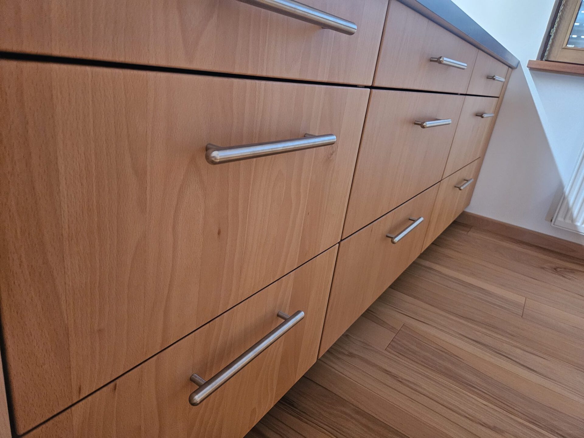 Diese maßgefertigte Küche verbindet zeitlose Eleganz mit praktischer Funktionalität. Die hochwertigen Buchenfronten bringen natürliche Wärme in den Raum und verleihen der Küche eine edle, langlebige Optik. Jedes Detail wurde individuell geplant, um Stauraum und Komfort optimal auf die Bedürfnisse des Alltags abzustimmen.