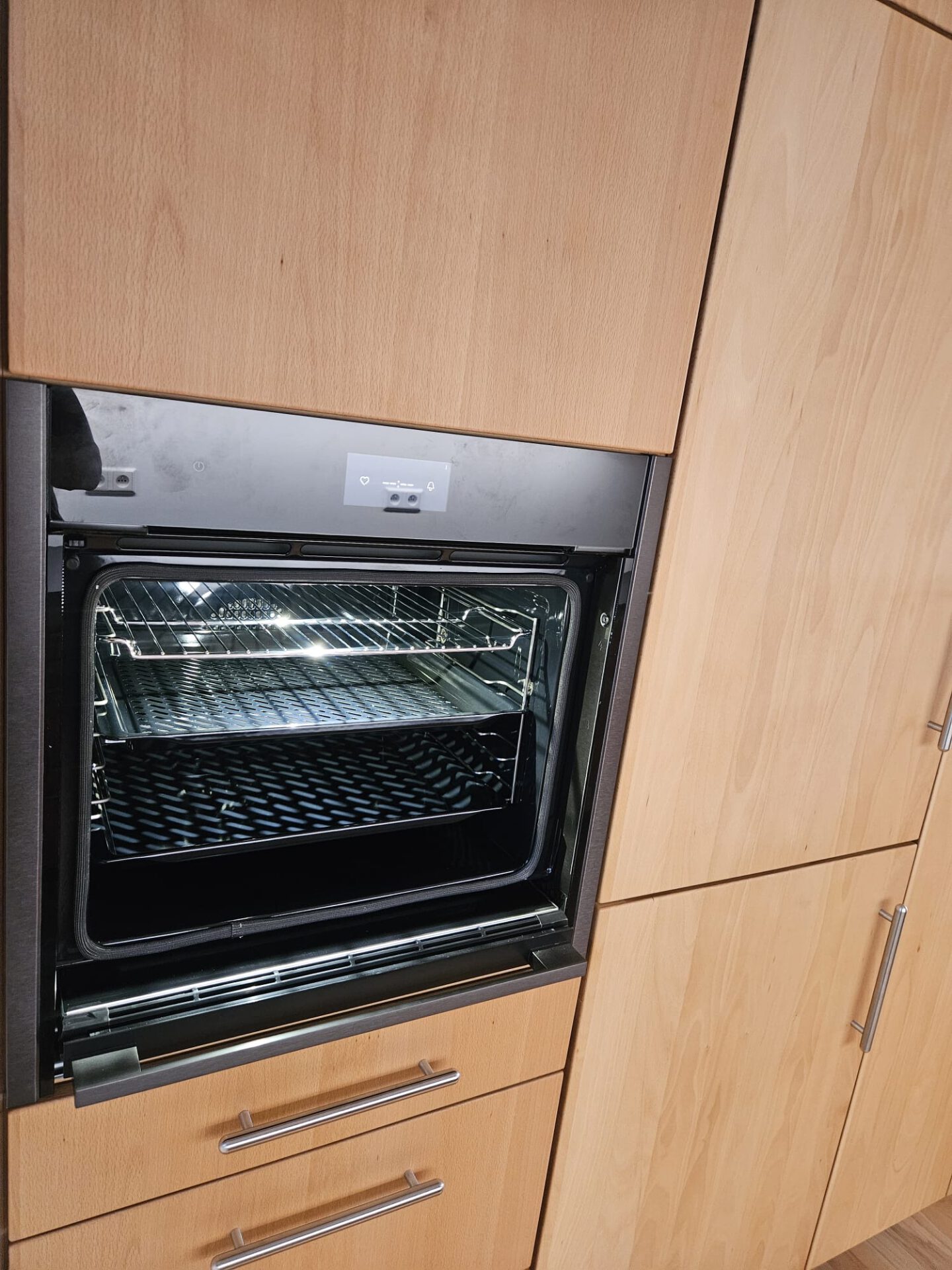Auch die Technik wurde stilvoll integriert: moderne Elektrogeräte, darunter ein Backofen mit versenkbarer Tür, fügen sich nahtlos ins Design ein und erhöhen den Bedienkomfort. Diese Küche steht für langlebige Materialien, präzise Verarbeitung und ein durchdachtes Gesamtkonzept, das Ästhetik und Alltagstauglichkeit perfekt verbindet.