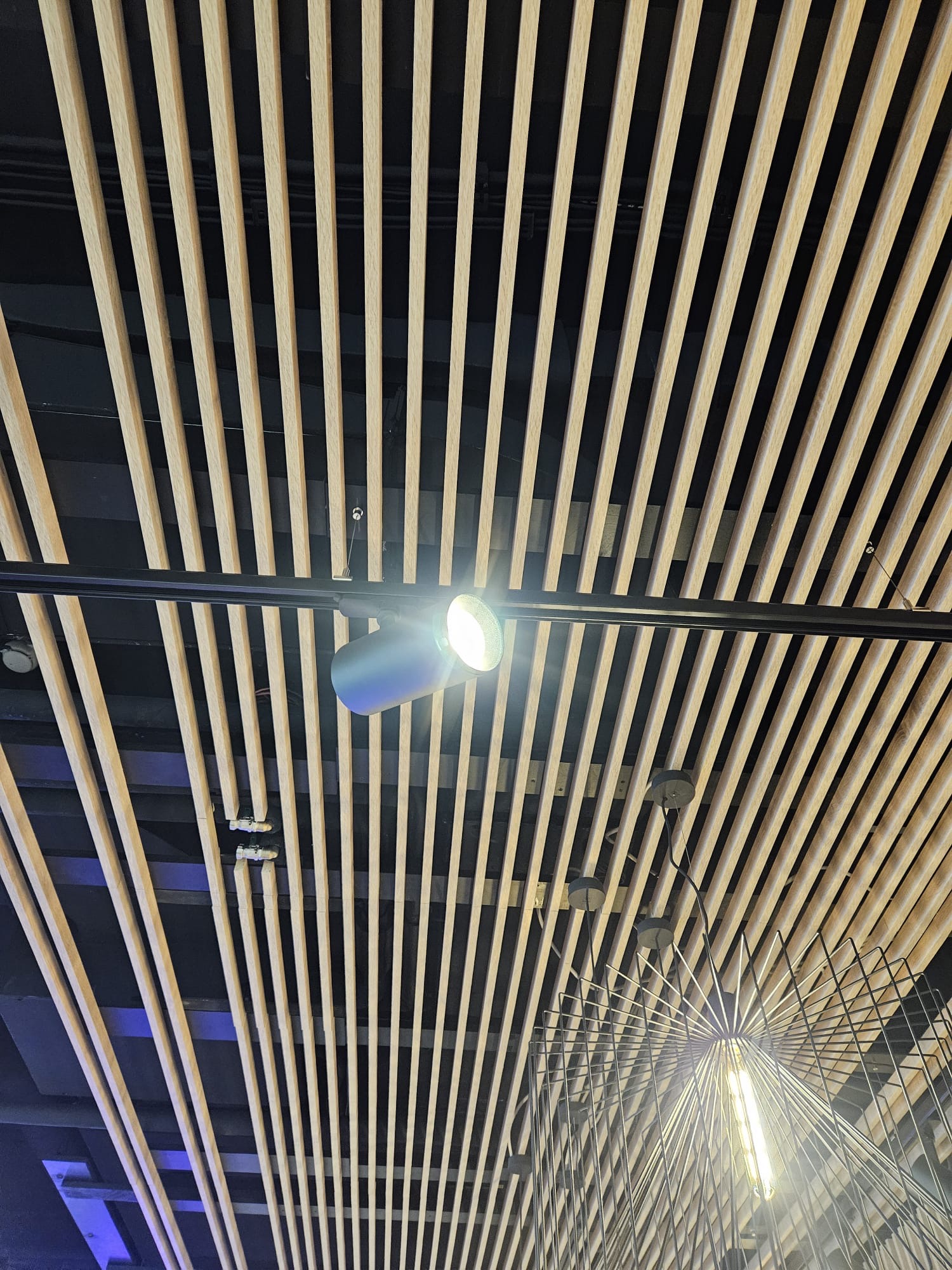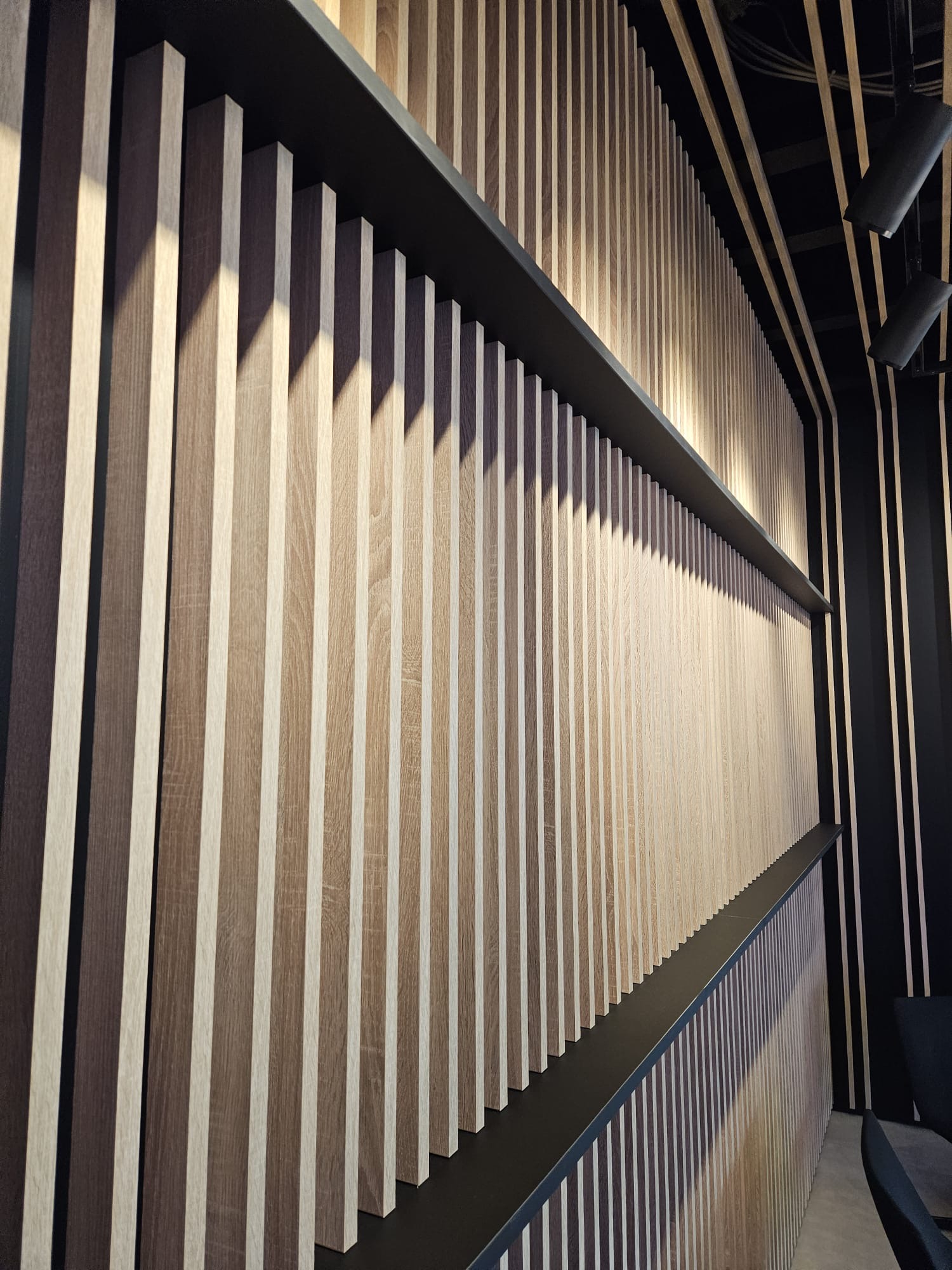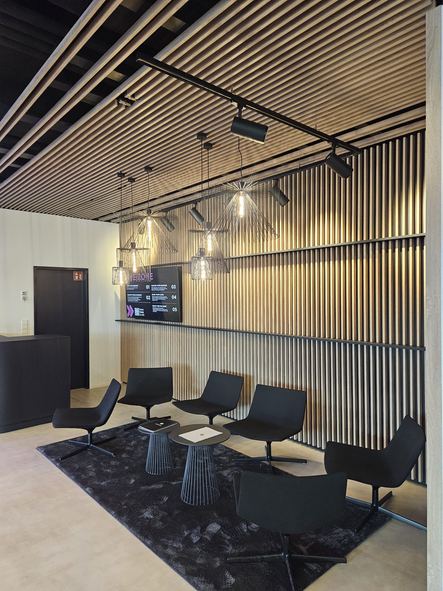 Für diesen Wartebereich haben wir eine elegante Wand- und Deckenverkleidung im Dekor Eiche gefertigt. Die Lamellen wurden unsichtbar an der Unterkonstruktion befestigt, was eine besonders cleane und moderne Optik schafft. Neben der ansprechenden Gestaltung sorgt die Verkleidung auch für eine ruhige, angenehme Atmosphäre im Raum.