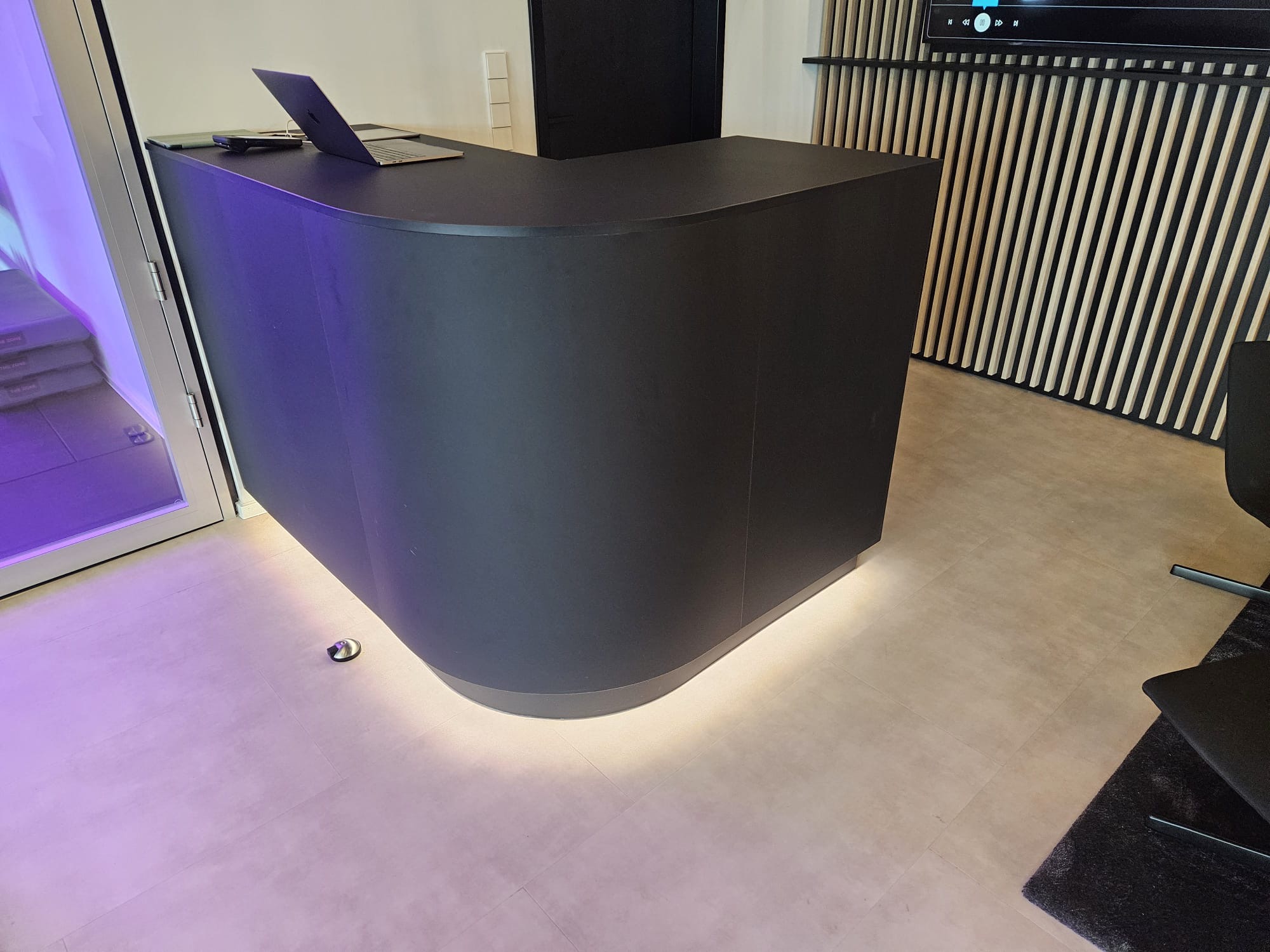 Als zentrales Element entstand außerdem ein Tresen, der sich harmonisch in das Gesamtkonzept integriert. Mit klaren Linien und stilvollem Design setzt er einen modernen Akzent und macht den Wartebereich einladend und funktional zugleich.