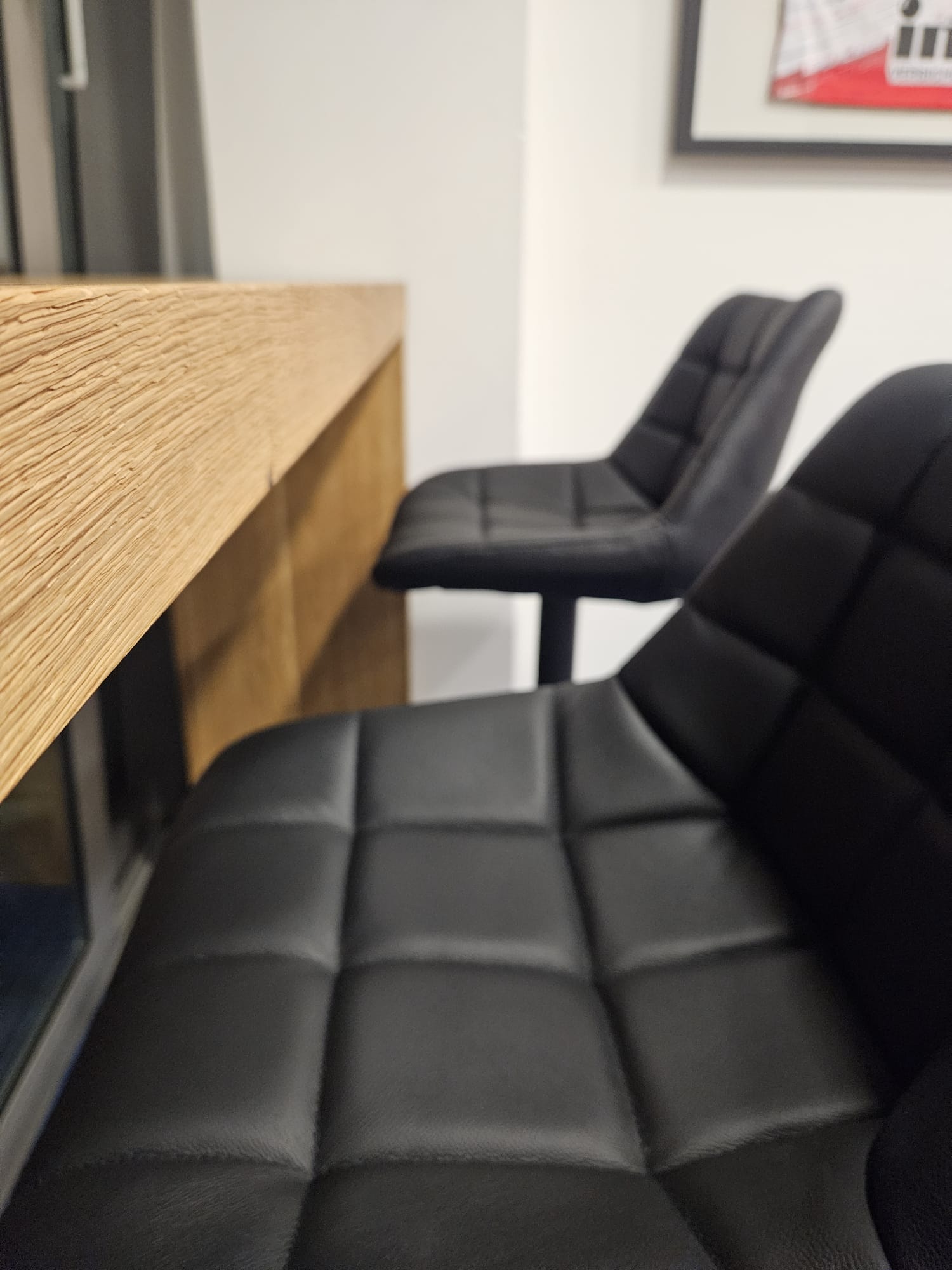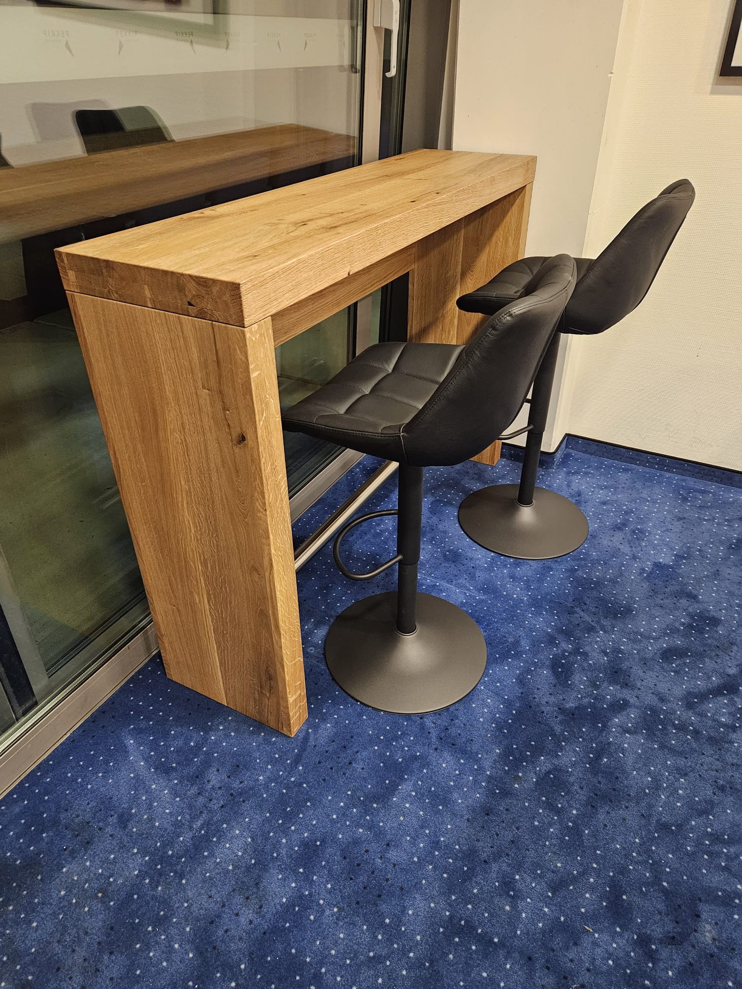 Ein zusätzlicher, kleinerer Thekentisch aus Asteiche ergänzt das Ensemble und kann flexibel im Raum oder am Fenster platziert werden. Die passenden Barhocker sind höhenverstellbar, drehbar und mit einer komfortablen Sitzschale aus schwarzem Leder ausgestattet – ideal auf die Tischhöhe abgestimmt.
