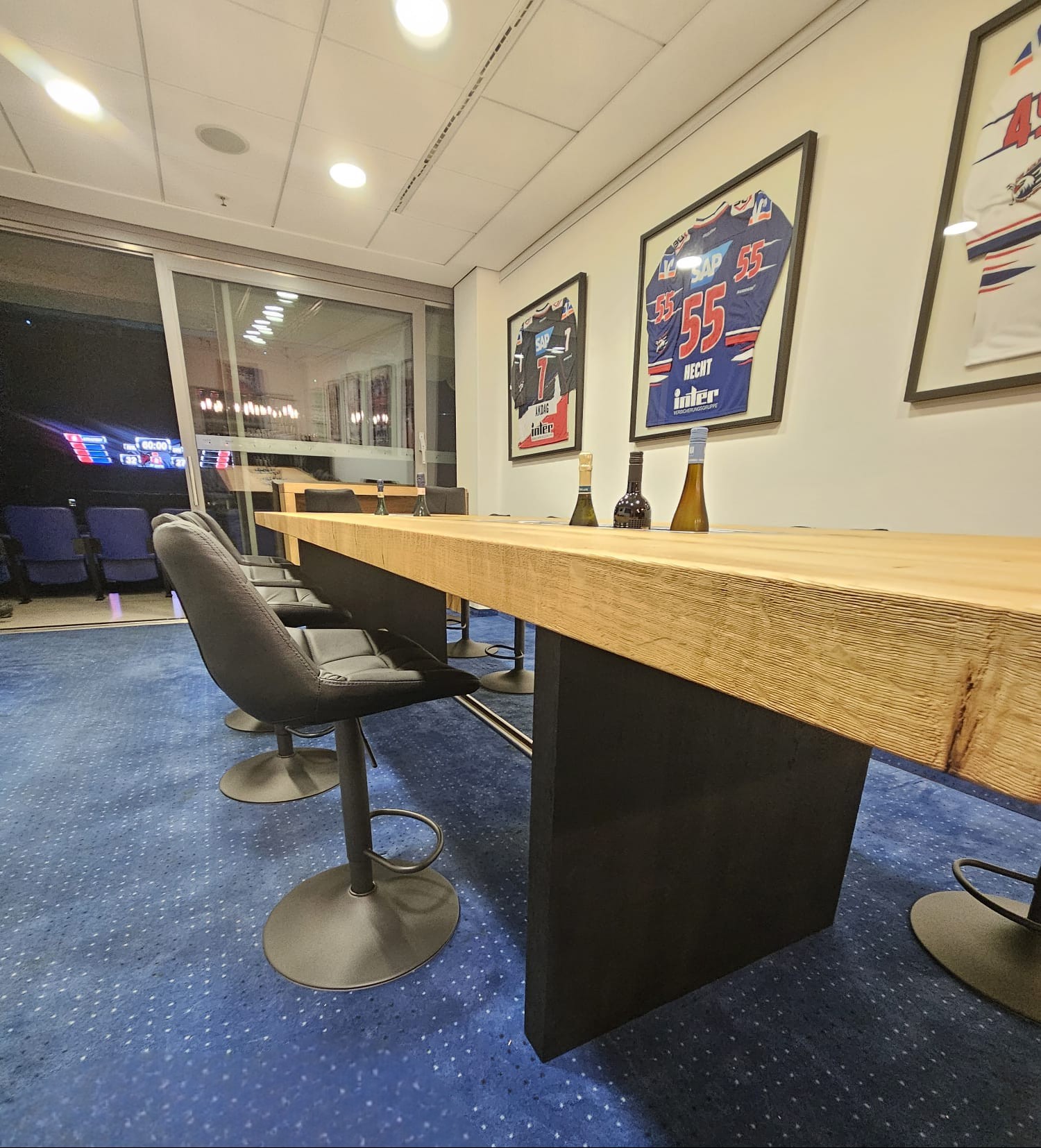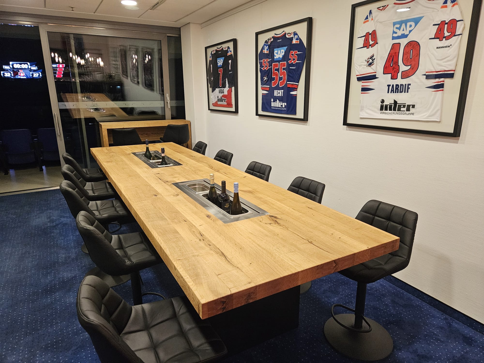 Besondere Akzente setzen die beiden bündig in die Tischplatte integrierten Edelstahl-Flaschenkühler, die mit Deckeln ausgestattet sind und den Tisch zu einem Highlight für Feiern und gemütliche Abende machen. Getragen wird die Platte von robusten Tischbeinen aus Eiche, die schwarz gebeizt wurden und perfekt mit der Oberfläche harmonieren.