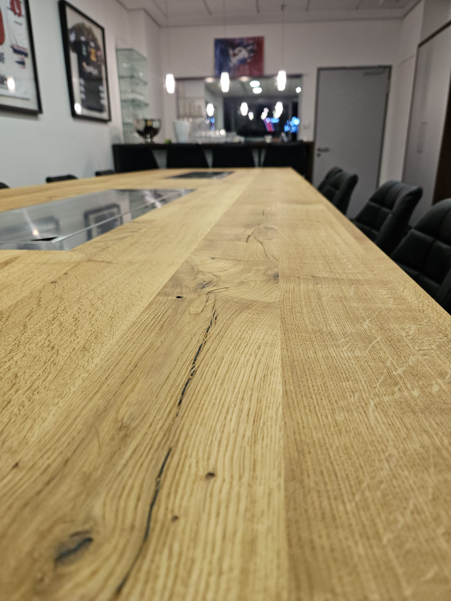 Für dieses Projekt entstand ein stilvoller Thekentisch aus massiver Asteiche, der als Mittelpunkt für gesellige Runden überzeugt. Die Tischplatte beeindruckt durch ihre natürliche Optik, bei der Äste und Risse elegant schwarz aufgefüllt wurden. Eine gebürstete Oberfläche, veredelt mit mattendem Hartwachsöl, unterstreicht die Langlebigkeit und verleiht dem Tisch eine angenehme Haptik.